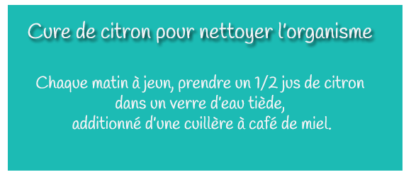 Le matin a jeun, prendre 1/2 citron pressé dans un verre d’eau tiède. On peut y ajouter une cuillerée à café de miel.